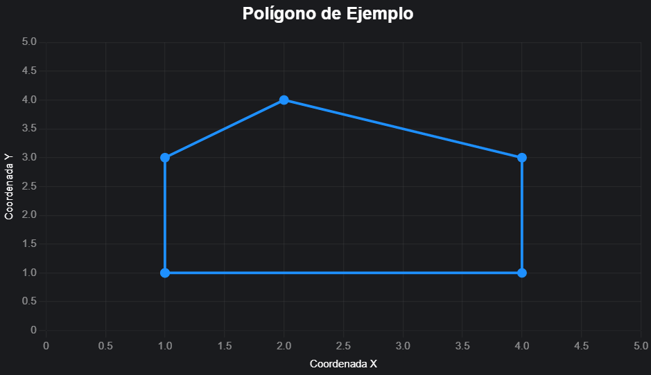 A continuación, se muestra un gráfico que representa el polígono del ejemplo con sus vértices para ayudarte a visualizar cómo se conectan las coordenadas: